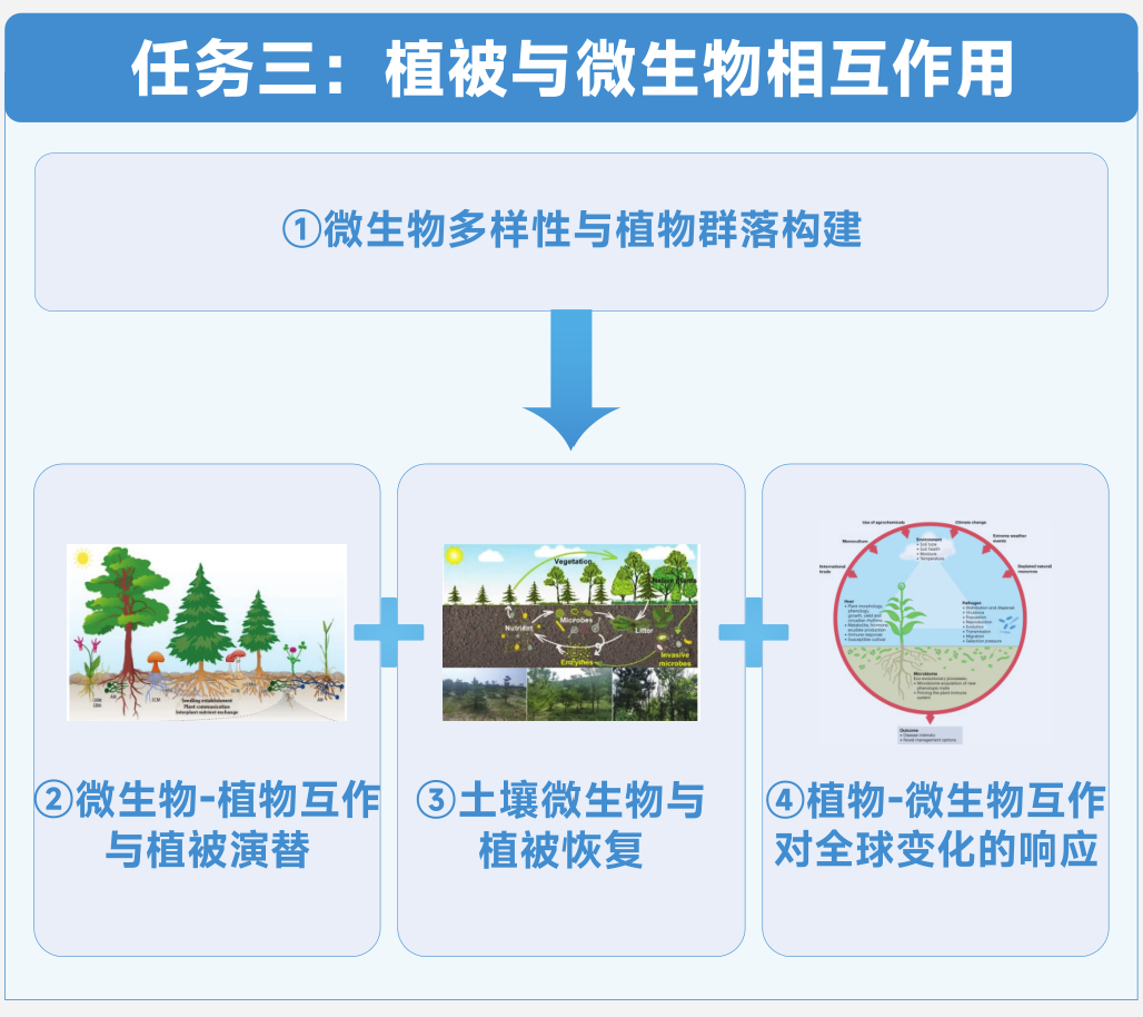 以植被系统中“植物-微生物”互作为核心,解析植被地上与地下微生物结构与功能,揭示微生物在植物群落结构、功能、恢复与建造等过程的关键作用,构建植被-微生物耦合体系,探索两者结构与功能协同关系和过程。