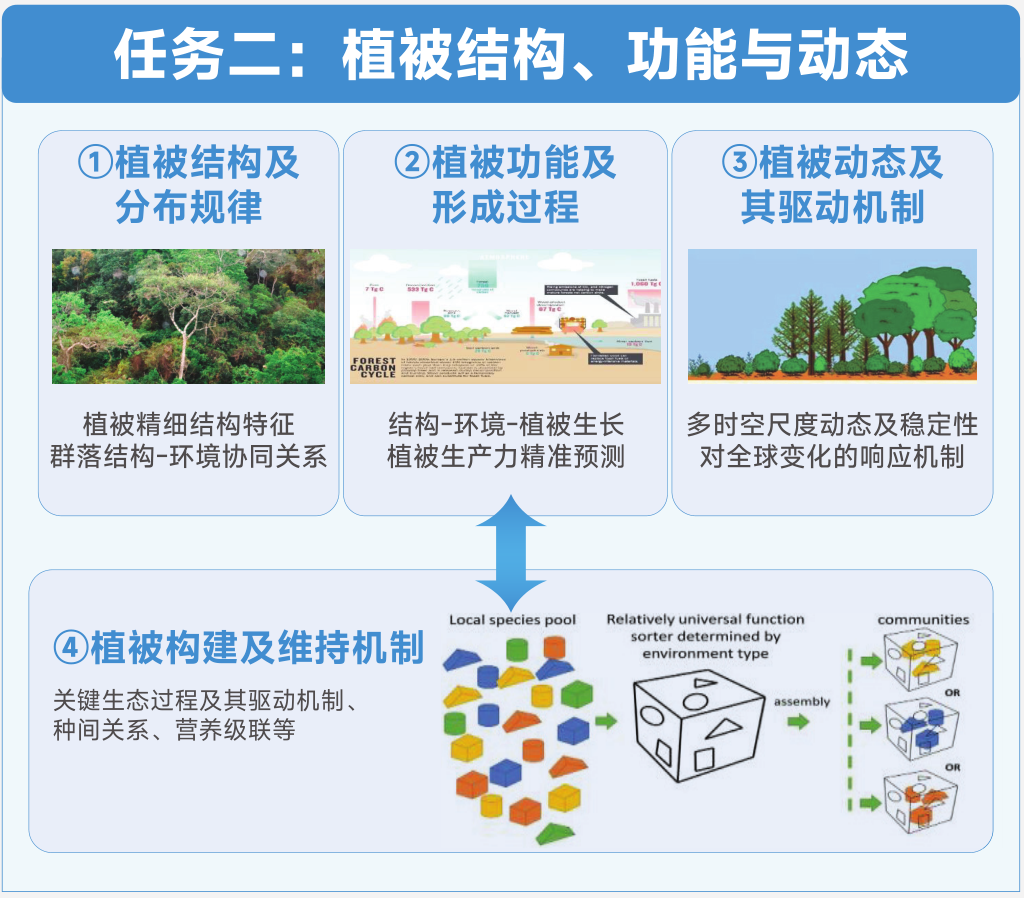 聚焦植被科学的核心理论问题,系统研究植被结构和功能的形成及其调控机制,揭示植被的动态规律及其对环境变化的响应模式,完善植被动态模型;创新植被结构-功能-动态理论体系,实现植被科学从经验统计走向定量计量,引领国际植被科学发展。