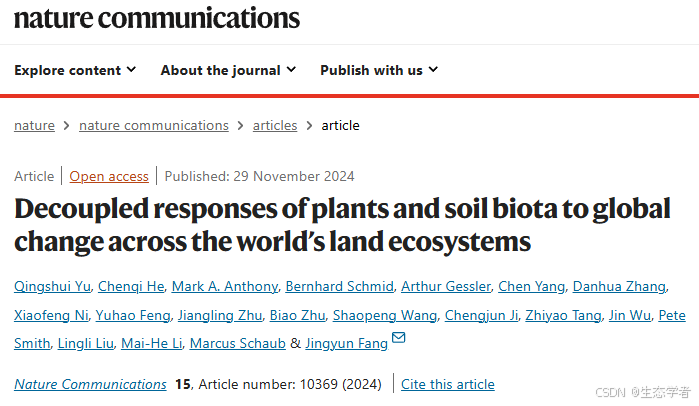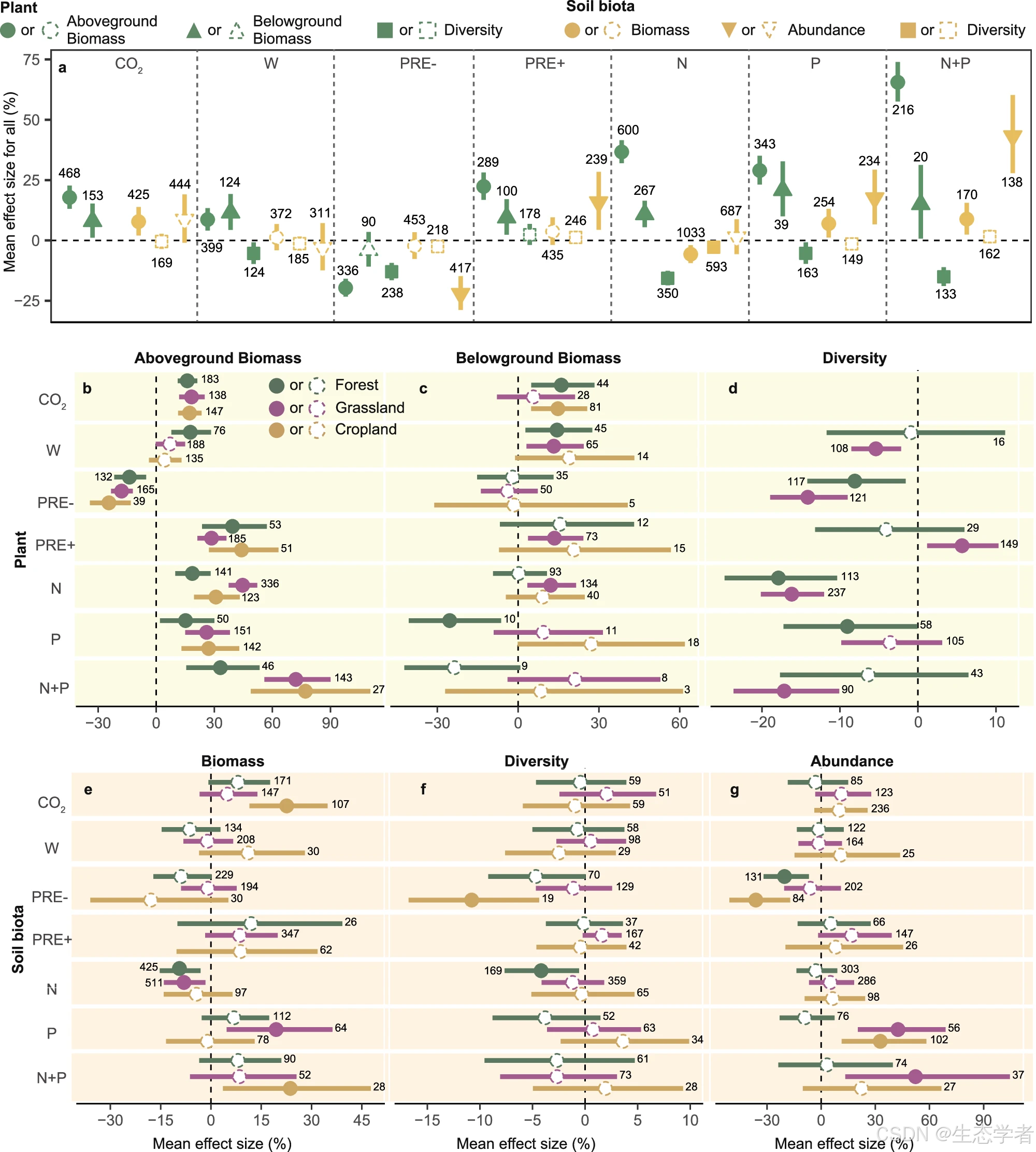基于此,植被结构功能与建造全国重点实验室主任方精云院士团队通过对全球1166篇陆地生态系统文献中13209个单次观测数据和3223个配对观测数据的综合分析,以量化不同生物群系中植物(生物量和多样性)和土壤生物群(生物量、多样性和丰度)对GCFs的响应(图1)。研究发现,GCFs总体上促进了植物生物量的增加,但降低了植物物种多样性。相比之下,地下土壤生物群对GCFs的响应变化更大,更难以预测。对地上和地下观测数据的分析表明,植物和土壤生物对GCFs的响应在不同生物群系的不同土壤生物群之间是解耦的。本研究强调了地上-地下系统综合研究对于改善全球环境变化后果预测的重要性。