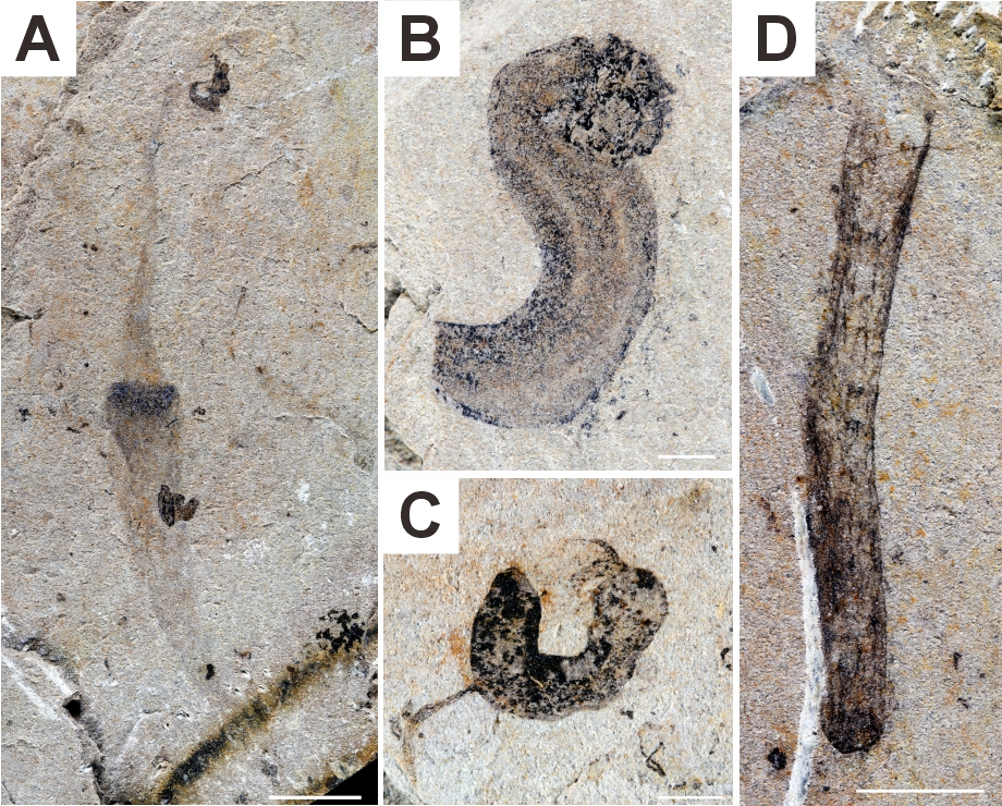 A. 具有翻吻和固着器的蠕虫状化石;B. 具有头部分化的蠕虫状化石;C. 寒武岐须虫类(cambroernids)化石;D. Margaretia外部管状结构。比例尺:5mm(A, D);2mm(B, C)。