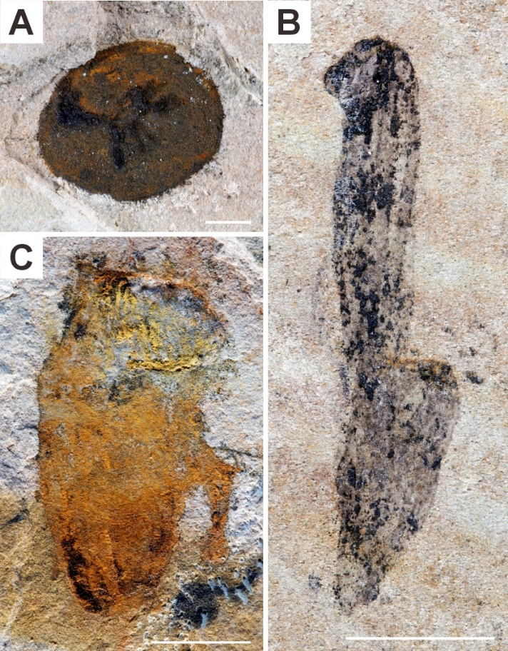 A. Radialomorph化石;B. Mackenzid-like化石;C. 栉水母动物(ctenophore)化石。比例尺:2mm(A);5mm(B, C)。