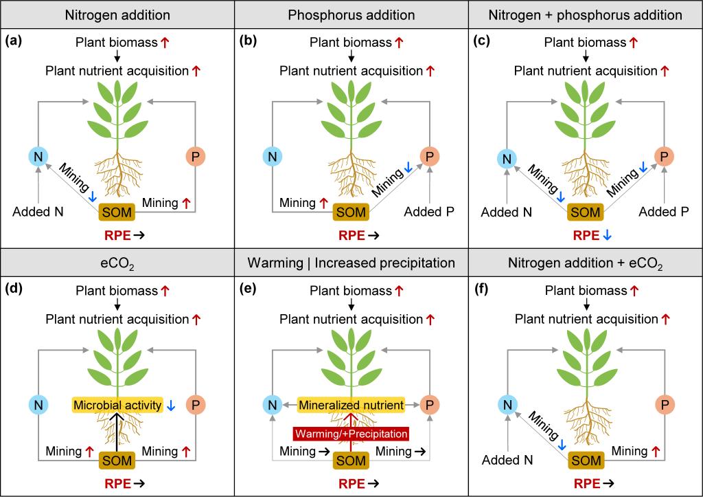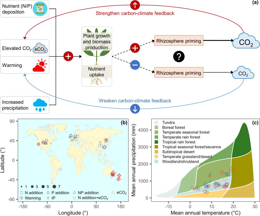 根际激发效应(Rhizosphere Priming Effect, RPE)指活体植物根系对土壤有机质分解速率的调控作用,是陆地碳循环和养分循环的重要环节。通过根际激发效应,植物不仅能影响自身养分获取,还对土壤碳储量和微生物群落结构产生长远影响。然而,随着全球气候变化及氮、磷等养分输入增加,人类活动对温度、CO₂浓度和降水模式的改变,根际激发效应的响应规律尚不清楚。理解不同全球变化因子(GCFs)对 RPE 的影响,对于预测土壤碳动态和全球碳平衡具有重要意义。