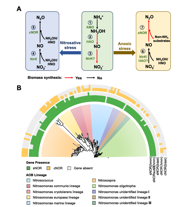 图一:AOB进行硝化菌反硝化的生理基础与系统发育分布