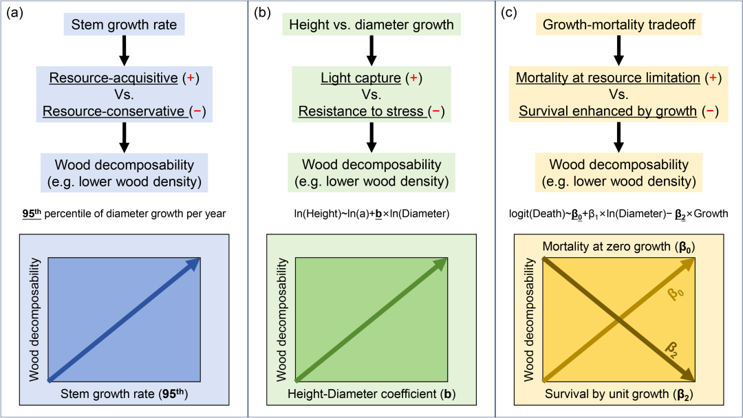 木材密度较低的树种往往生长迅速(a),更侧重垂直生长(b),且在资源限制条件下死亡率更高或单位生长量下的存活率增长更低(c)。由于木材密度与木材可分解性呈负相关,我们假设木材可分解性与树木生长策略之间存在正向的协同关系。