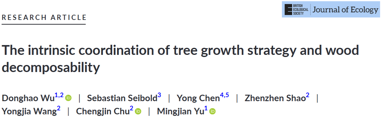 许多研究表明植物功能性状可通过“死亡后效应”调控植物残体分解。生长策略分化是驱动植物功能性状种间差异的主要原因,但鲜有研究探索植物生长策略与木材分解速率的直接关联。近日,植被结构功能与建造全国重点实验室于明坚教授-巫东豪研究员团队在Journal of Ecology上发表了题为“The intrinsic coordination of tree growth strategy and wood decomposability”的研究论文。课题组以广东省黑石顶50公顷常绿阔叶林动态监测样地为研究平台,基于群落调查数据计算120个优势树种的树干径向生长速率、树高-胸径异速生长系数、生长-死亡权衡等生长策略参数,测定各树种木质残体的功能性状和分解速率,探究木本植物生长策略与分解速率的内在协同关系及其关键介导性状。该研究假设,采用快速生长策略的物种(即生长迅速、需光性强且死亡率高)比缓慢生长策略物种的分解速度更快,这是因为速生树种较低的木材密度更受白蚁等分解者的偏好。