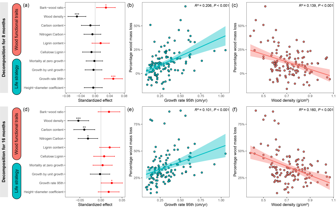 上图(a-c)与下图(d-f)分别对应两个不同时间跨度(8个月与16个月)的实验结果。图a和d中的显著性水平标注为:* p < 0.05;** p < 0.01;*** p < 0.001。其中,树干生长速率与木材密度是两个最佳预测因子,前者与木材可分解性正相关,后者则与木材可分解性负相关。